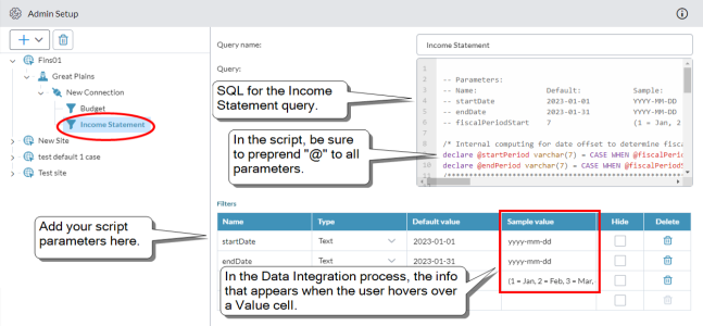 Note: If your query uses parameters, within the SQL text, you must preprend @ to each parameter name. For example, startDate must appear as @startDate.