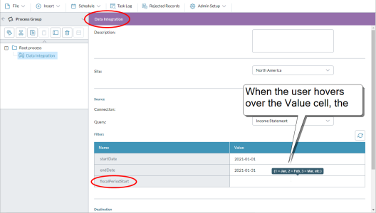 - Default value: What the user sees in the Data Integration process and can edit. Up to 50 characters.