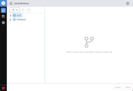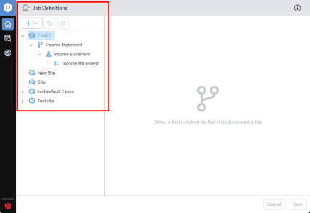 The Job Definitions panel which contains a tree of your Data Integration sites and their respective jobs, steps, and tasks: