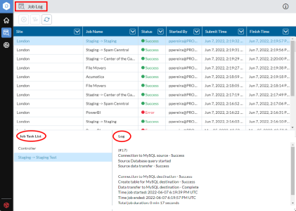 - The Job Log panel, showing all jobs, steps, and tasks, and their statuses